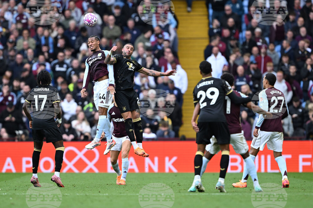 Burnley's Lesley Ugochukwu, left, and Aston Villa's Evann Guessand battle for the ball during the English Premier League soccer match between Aston Villa and Burnley at Villa Park, in Birmingham, England, Sunday Oct. 5, 2025. (Cody Froggatt/PA via AP)