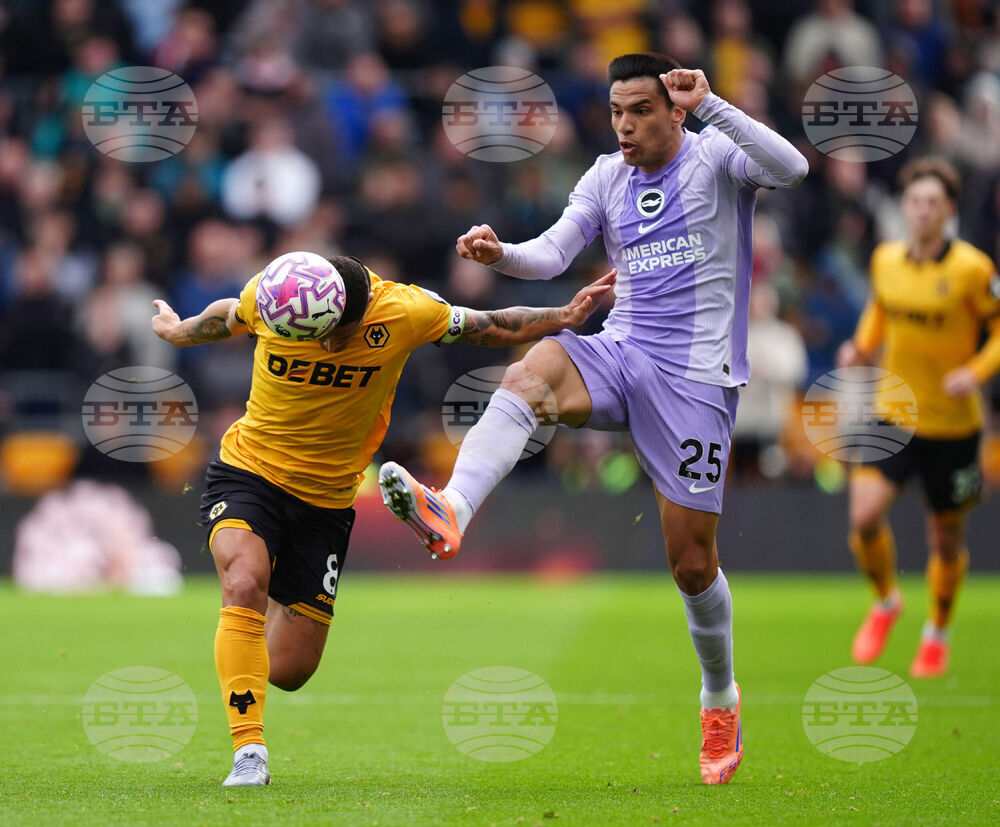 Wolverhampton Wanderers' Joao Gomes, left, and Brighton and Hove Albion's Diego Gomez battle for the ball during their English Premier League soccer match at Molineux Stadium, Wolverhampton, England, Sunday, Oct. 5, 2025. (Jacob King/PA via AP)