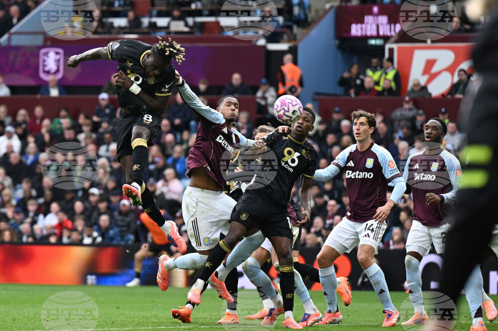 Aston Villa goalkeeper Emiliano Martinez, right, saves a shot from Burnley's Quilindschy Hartman during the English Premier League soccer match between Aston Villa and Burnley at Villa Park, in Birmingham, England, Sunday Oct. 5, 2025. (Nick Potts/PA via AP)