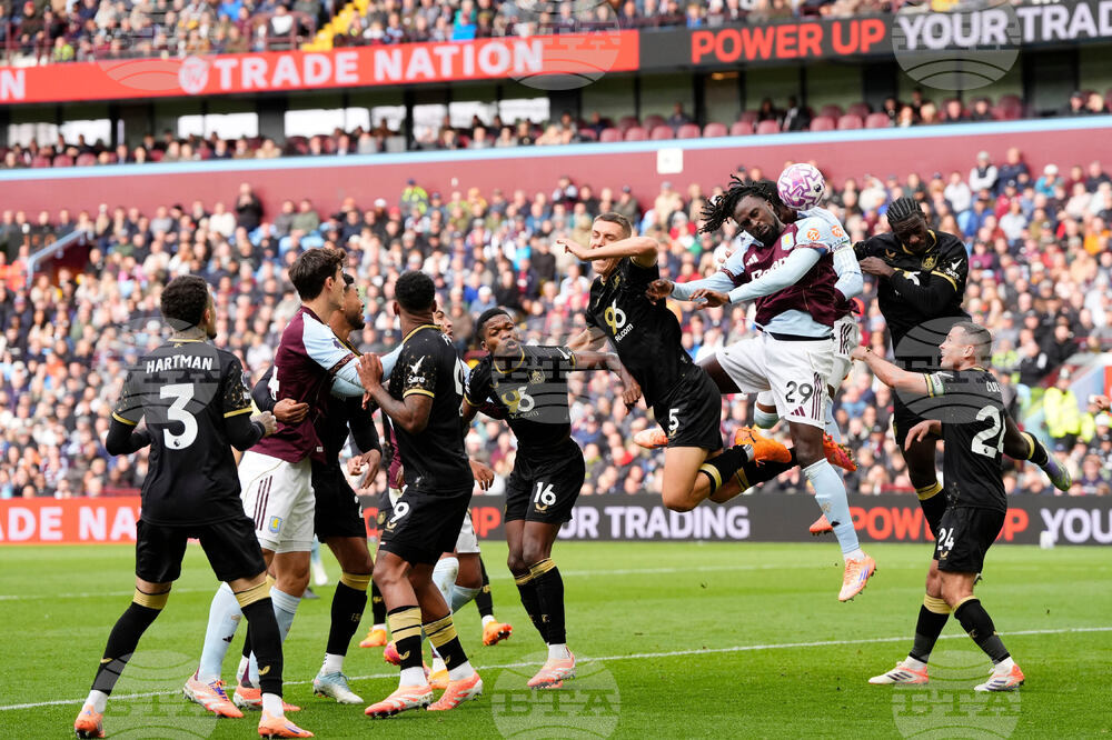 Aston Villa goalkeeper Emiliano Martinez, right, saves a shot from Burnley's Quilindschy Hartman, 3rd left, during the English Premier League soccer match between Aston Villa and Burnley at Villa Park, in Birmingham, England, Sunday Oct. 5, 2025. (Cody Froggatt/PA via AP)