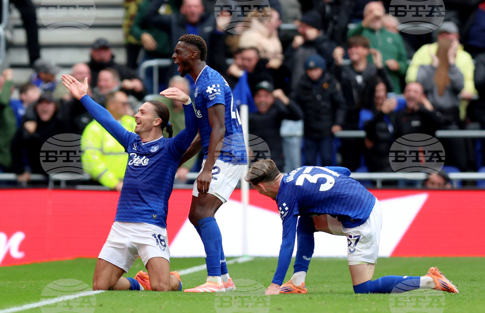 Everton's Jack Grealish, left, celebrates after scoring his sides second goal during their English Premier League soccer match against Crystal Palace at Molineux Stadium, Wolverhampton, England, Sunday, Oct. 5, 2025. (Jacob King/PA via AP)