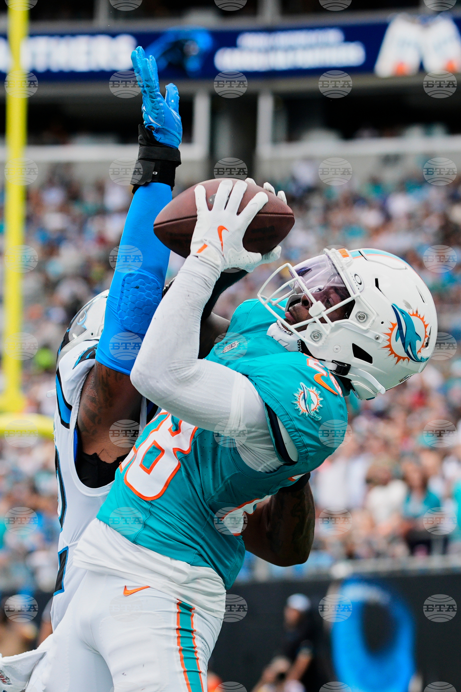 Miami Dolphins wide receiver Jaylen Waddle scores ahead of Carolina Panthers cornerback Mike Jackson during the second half of an NFL football game, Sunday, Oct. 5, 2025, in Charlotte, N.C. (AP Photo/Jacob Kupferman)