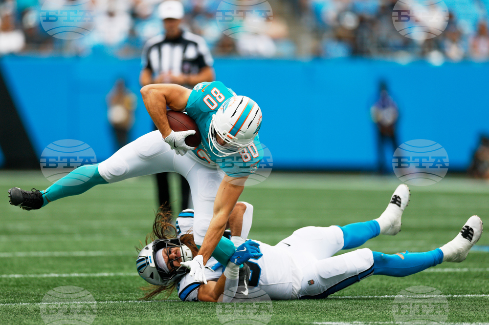Miami Dolphins tight end Julian Hill is tackled by the Carolina Panthers during the first half of an NFL football game, Sunday, Oct. 5, 2025, in Charlotte, N.C. (AP Photo/Rusty Jones)