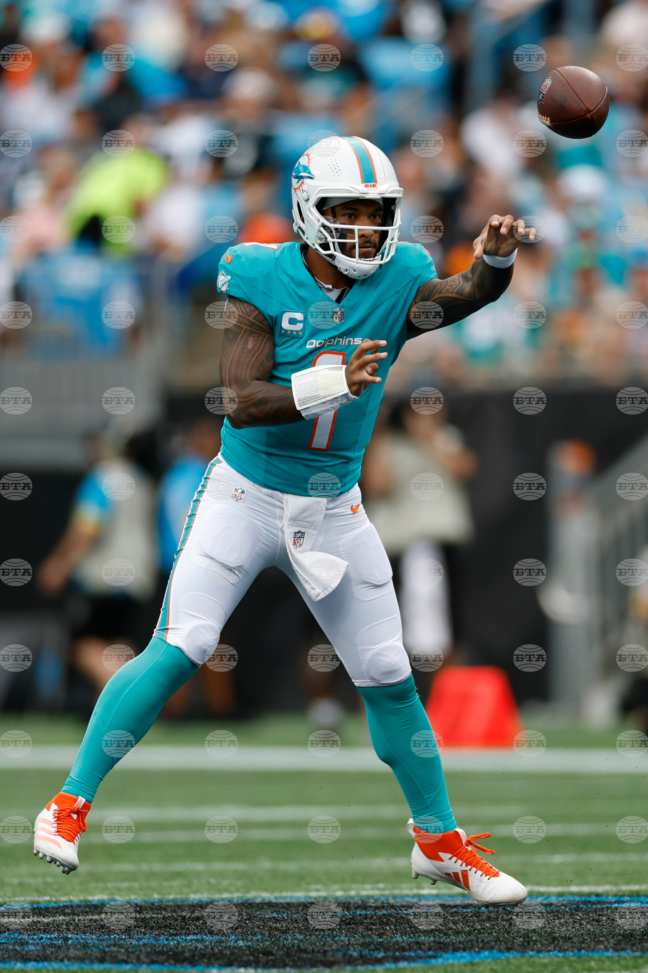 Miami Dolphins quarterback Tua Tagovailoa passes against the Carolina Panthers during the first half of an NFL football game, Sunday, Oct. 5, 2025, in Charlotte, N.C. (AP Photo/Rusty Jones)