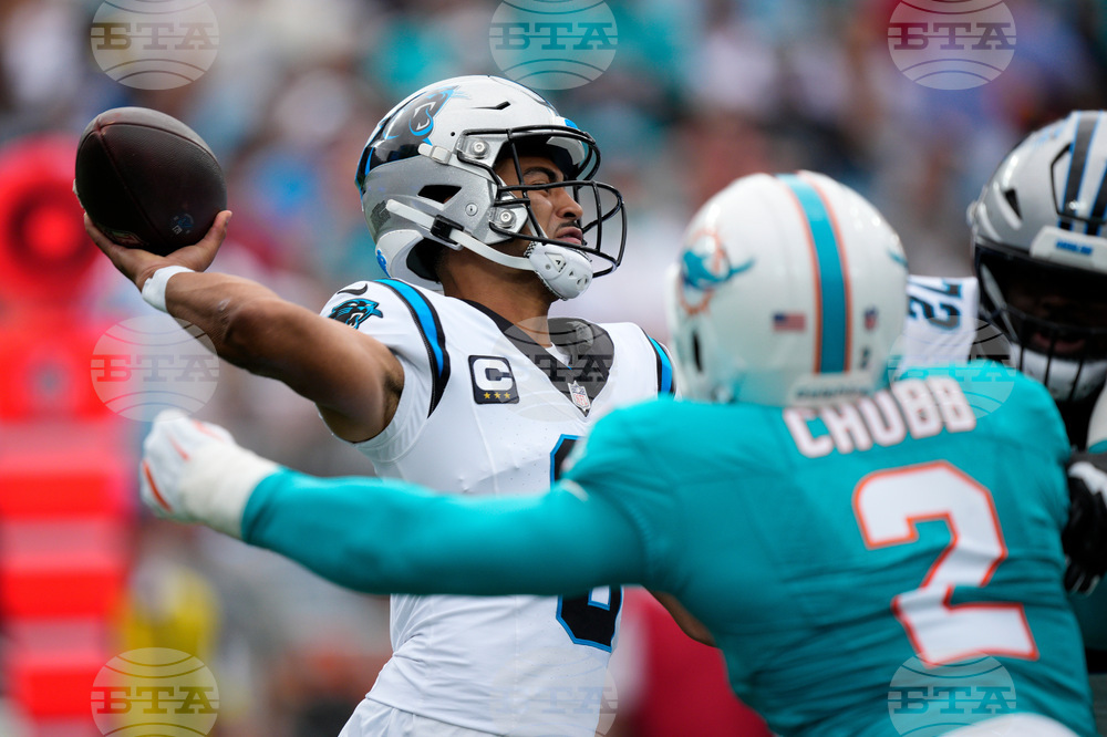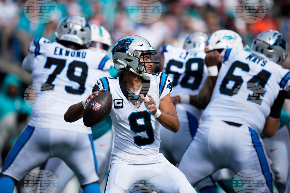 Carolina Panthers quarterback Bryce Young passes against the Miami Dolphins during the first half of an NFL football game, Sunday, Oct. 5, 2025, in Charlotte, N.C. (AP Photo/Jacob Kupferman)