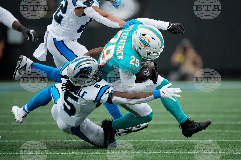 Carolina Panthers running back Rico Dowdle is tackled by Miami Dolphins free safety Minkah Fitzpatrick during the first half of an NFL football game, Sunday, Oct. 5, 2025, in Charlotte, N.C. (AP Photo/Rusty Jones)