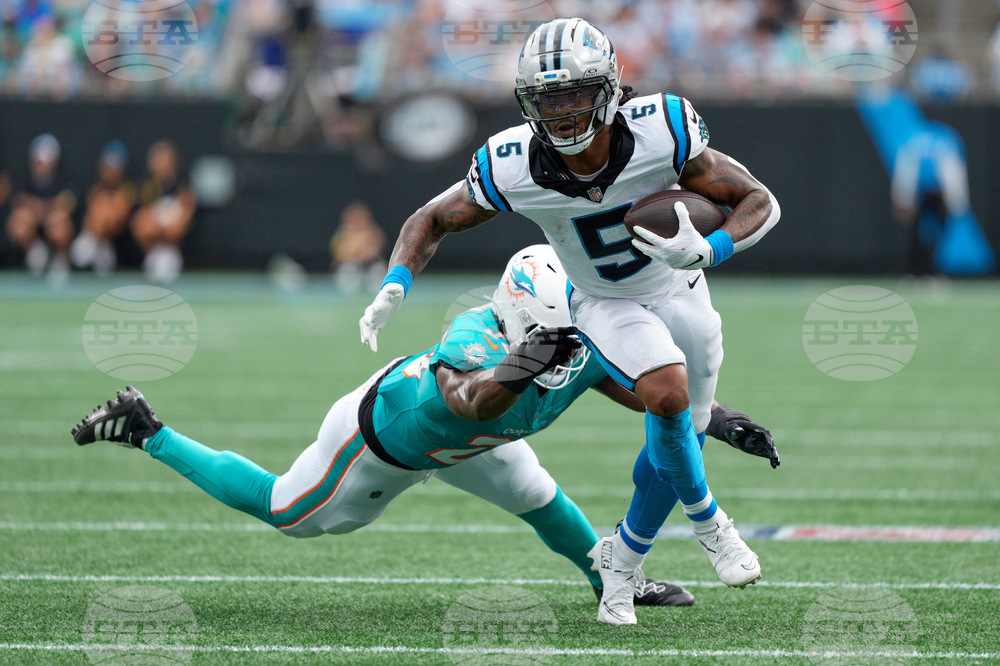 Carolina Panthers running back Rico Dowdle runs past Miami Dolphins linebacker Tyrel Dodson during the first half of an NFL football game, Sunday, Oct. 5, 2025, in Charlotte, N.C. (AP Photo/Jacob Kupferman)
