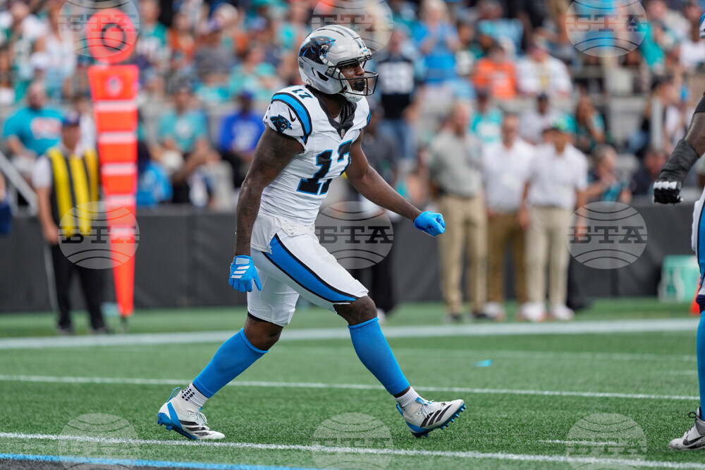 Carolina Panthers wide receiver Xavier Legette celebrates after scoring against the Miami Dolphins during the first half of an NFL football game, Sunday, Oct. 5, 2025, in Charlotte, N.C. (AP Photo/Jacob Kupferman)