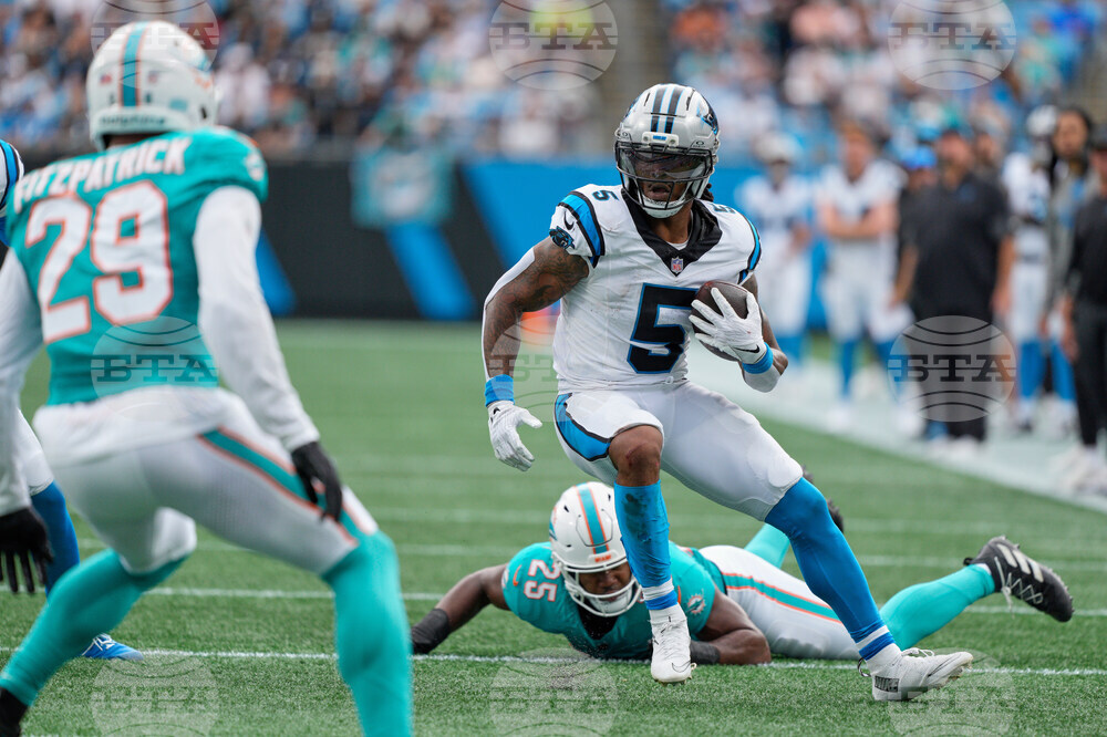 Miami Dolphins wide receiver Dee Eskridge runs against the Carolina Panthers during the first half of an NFL football game, Sunday, Oct. 5, 2025, in Charlotte, N.C. (AP Photo/Jacob Kupferman)