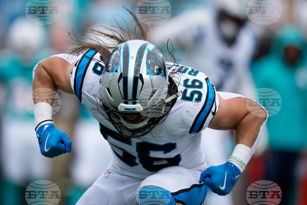Carolina Panthers linebacker Christian Rozeboom celebrates after a tackle against the Miami Dolphins during the second half of an NFL football game, Sunday, Oct. 5, 2025, in Charlotte, N.C. (AP Photo/Jacob Kupferman)