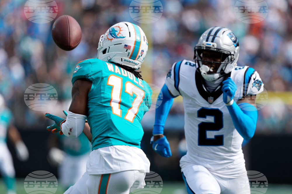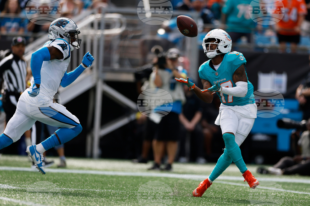 Miami Dolphins wide receiver Jaylen Waddle catches a pass against the Carolina Panthers during the first half of an NFL football game, Sunday, Oct. 5, 2025, in Charlotte, N.C. (AP Photo/Jacob Kupferman)