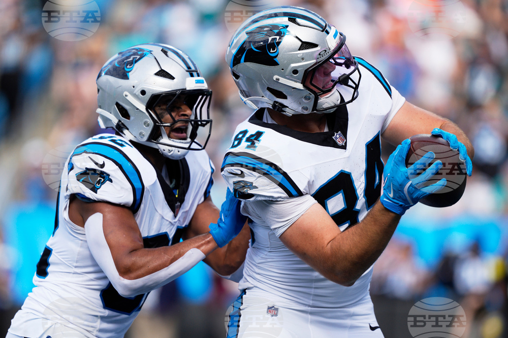 Carolina Panthers tight end Mitchell Evans scores against the Miami Dolphins during the second half of an NFL football game, Sunday, Oct. 5, 2025, in Charlotte, N.C. (AP Photo/Jacob Kupferman)