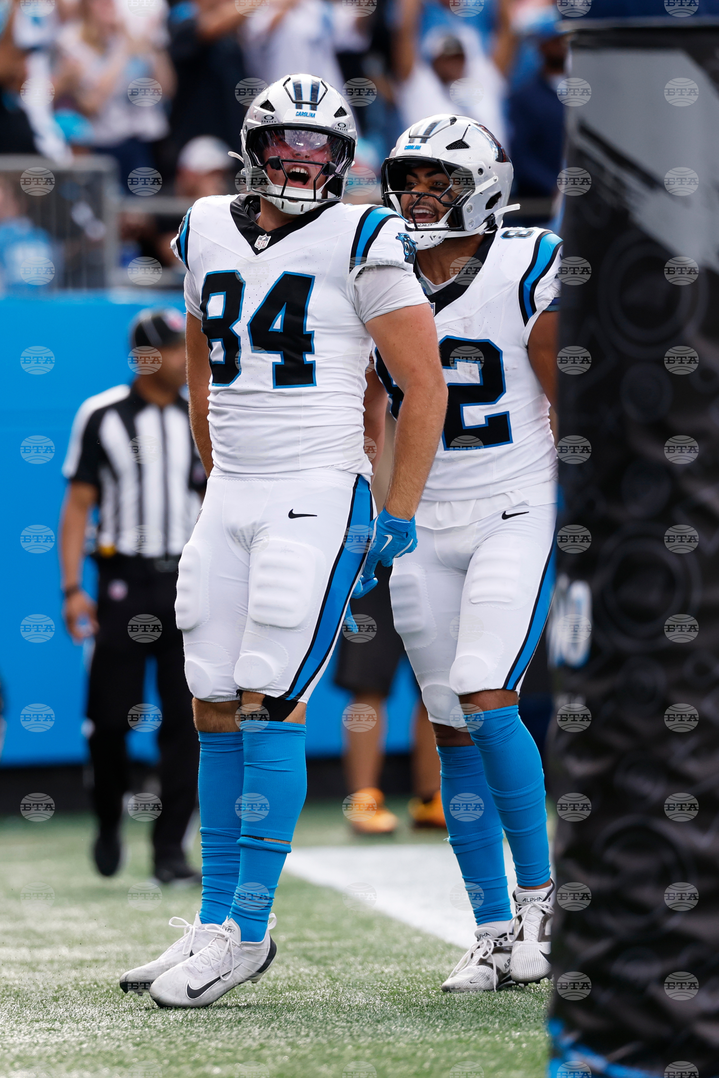 Carolina Panthers tight end Mitchell Evans celebrates after scoring against the Miami Dolphins during the second half of an NFL football game, Sunday, Oct. 5, 2025, in Charlotte, N.C. (AP Photo/Jacob Kupferman)