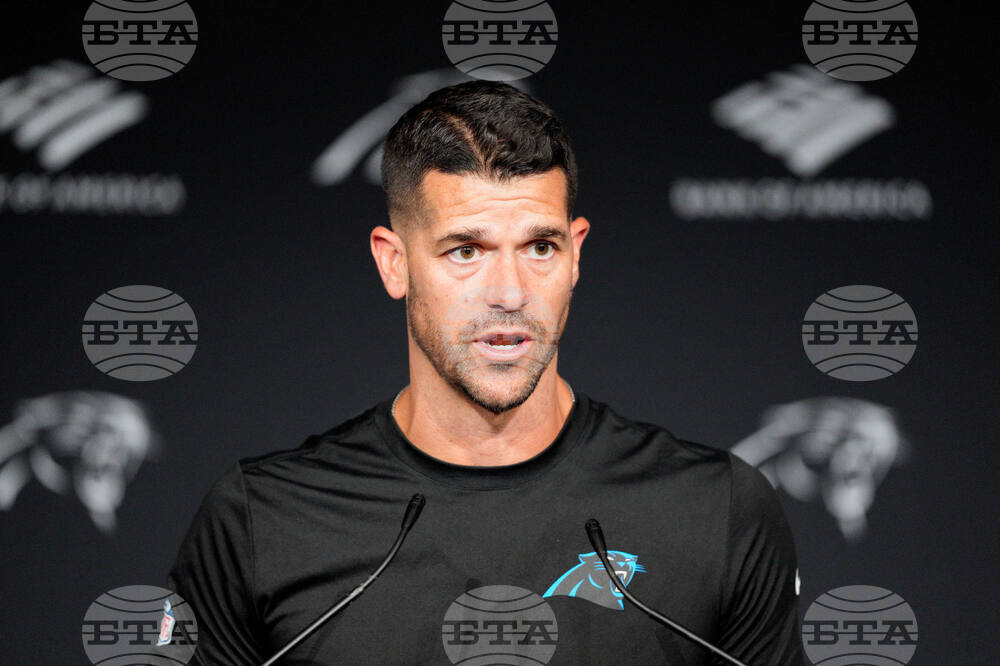 Carolina Panthers head coach Dave Canales speaks during a news conference after an NFL football game against the Miami Dolphins, Sunday, Oct. 5, 2025, in Charlotte, N.C. (AP Photo/Jacob Kupferman)