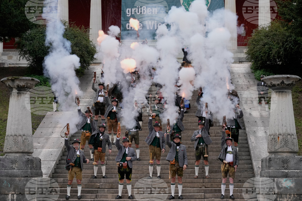 Bavarian riflemen and women in traditional costumes fire their muzzle loaders on the last day of the 190th Oktoberfest beer festival in Munich, Germany, Sunday, Oct. 5, 2025. (AP Photo/Matthias Schrader)