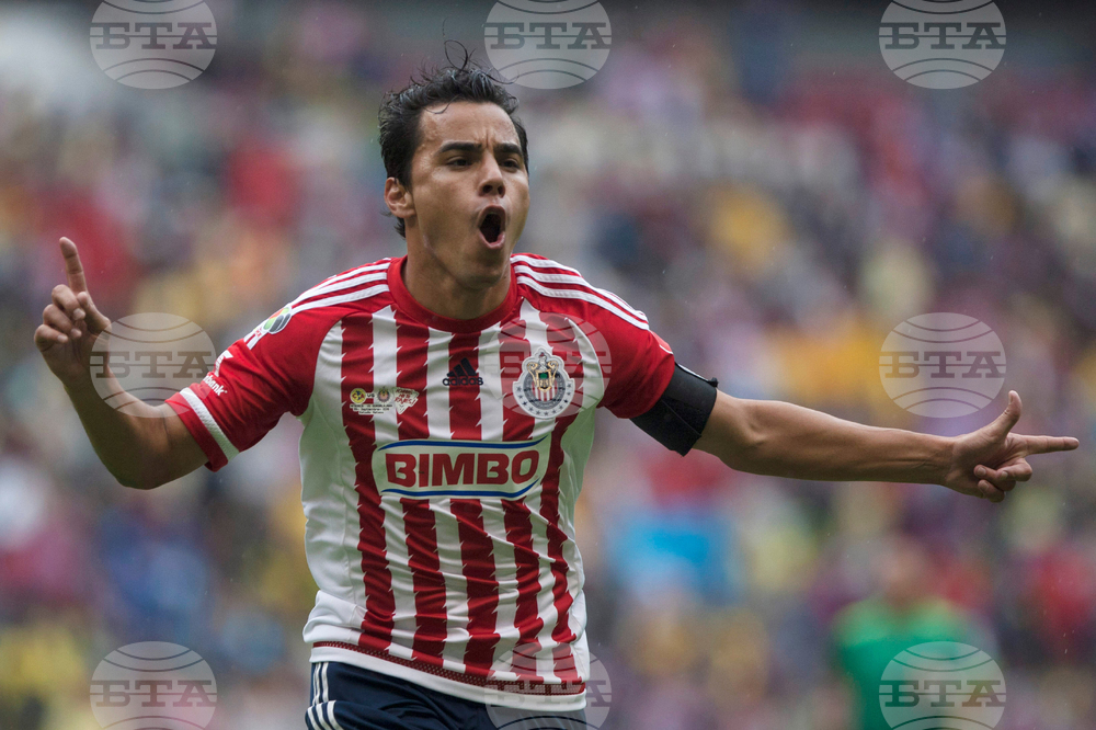 FILE - Chivas' Omar Bravo celebrates his goal against America during a Mexican soccer league match in Mexico City, Sept. 26, 2015. (AP Photo/Christian Palma, File)
