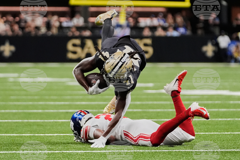 New York Giants tight end Daniel Bellinger (82) is hit by New Orleans Saints safety Jonas Sanker (33) in the first half of an NFL football game, Sunday, Oct. 5, 2025, in New Orleans. (AP Photo/Butch Dill)