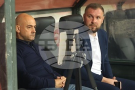 София (5 октомври 2025) Футболна среща от 11-ти кръг на Efbet лига се провежда между отборите на ЦСКА София и Лудогорец Разград на националния стадион “Васил Левски”. На снимката (от ляво надясно): старши треньорът на Лудогорец Разград- Руи Мота и Козмин Моци .