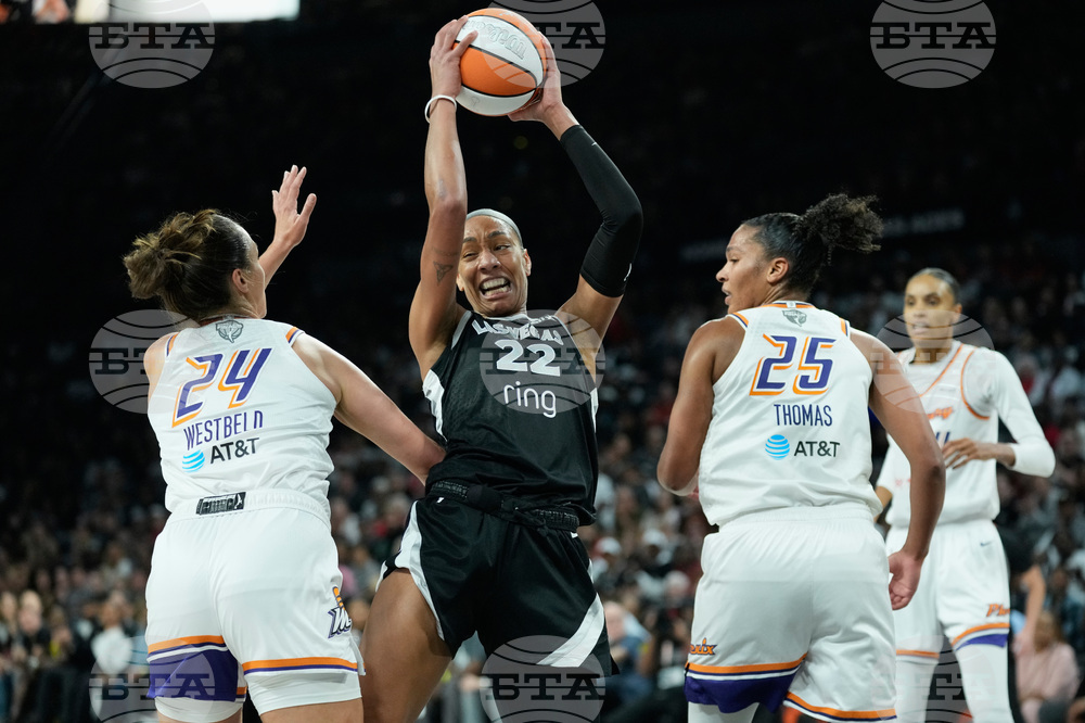 Las Vegas Aces center A'ja Wilson (22) grabs a rebound against Phoenix Mercury forward Kathryn Westbeld (24) during the first half in Game 2 of the WNBA basketball finals, Sunday, Oct. 5, 2025, in Las Vegas. (AP Photo/John Locher)