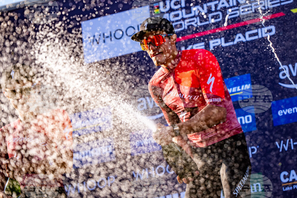 Christopher Blevins, of the United States, celebrates during the podium ceremony of the Men's Elite Mountain Bike Cross Country World Cup, Sunday, Oct. 5, 2025, in Lake Placid, N.Y. (Maxime Schmid/Keystone via AP)/Keystone via AP)
