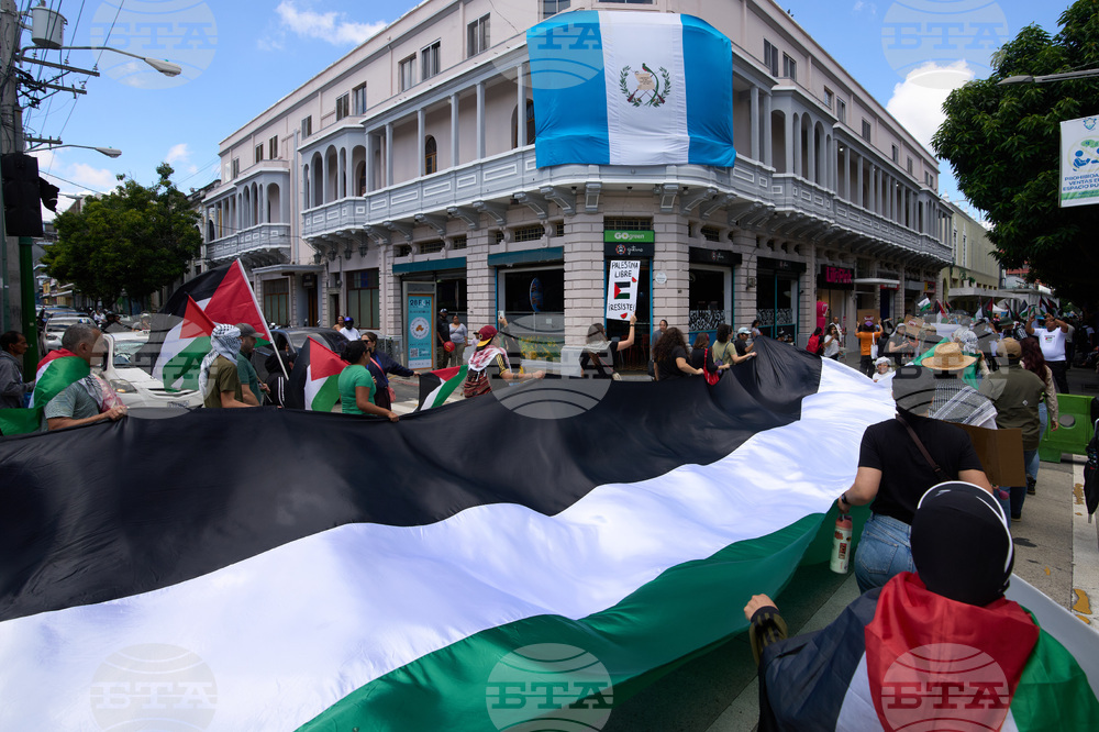 Demonstrators take part in a pro-Palestinian march in Guatemala City, Sunday, Oct. 5, 2025. (AP Photo/Moises Castillo)