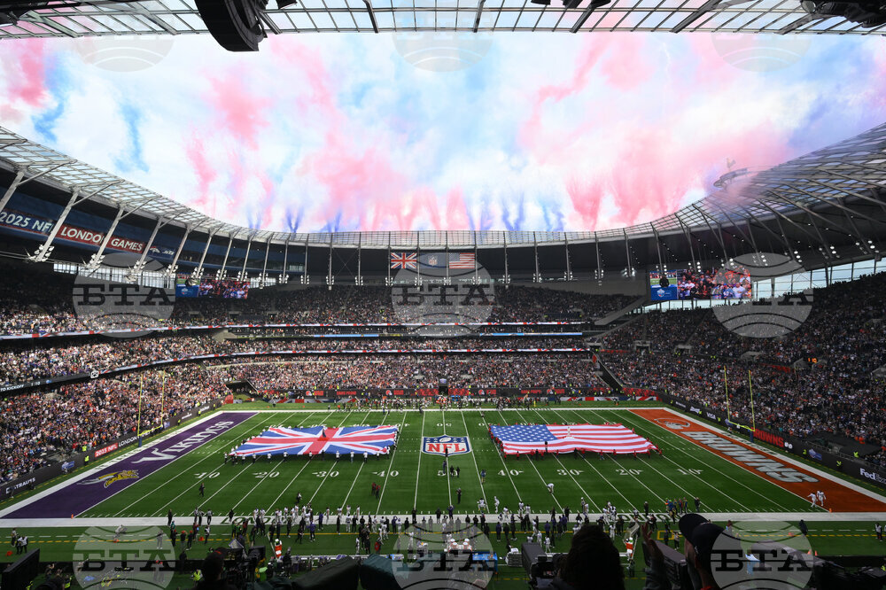 A general view of the field with the British and United States flags before an NFL football game between the Cleveland Browns and the Minnesota Vikings at Tottenham Hotspur Stadium in London, Sunday, Oct. 5, 2025. (AP Photo/Ant Upton)