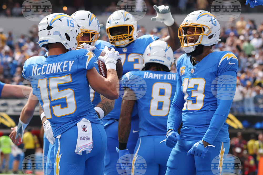 Los Angeles Chargers wide receiver Ladd McConkey (15) celebrates his touchdown catch during the first half of an NFL football game against the Washington Commanders, Sunday, Oct. 5, 2025, in Inglewood, Calif. (AP Photo/Eric Thayer)