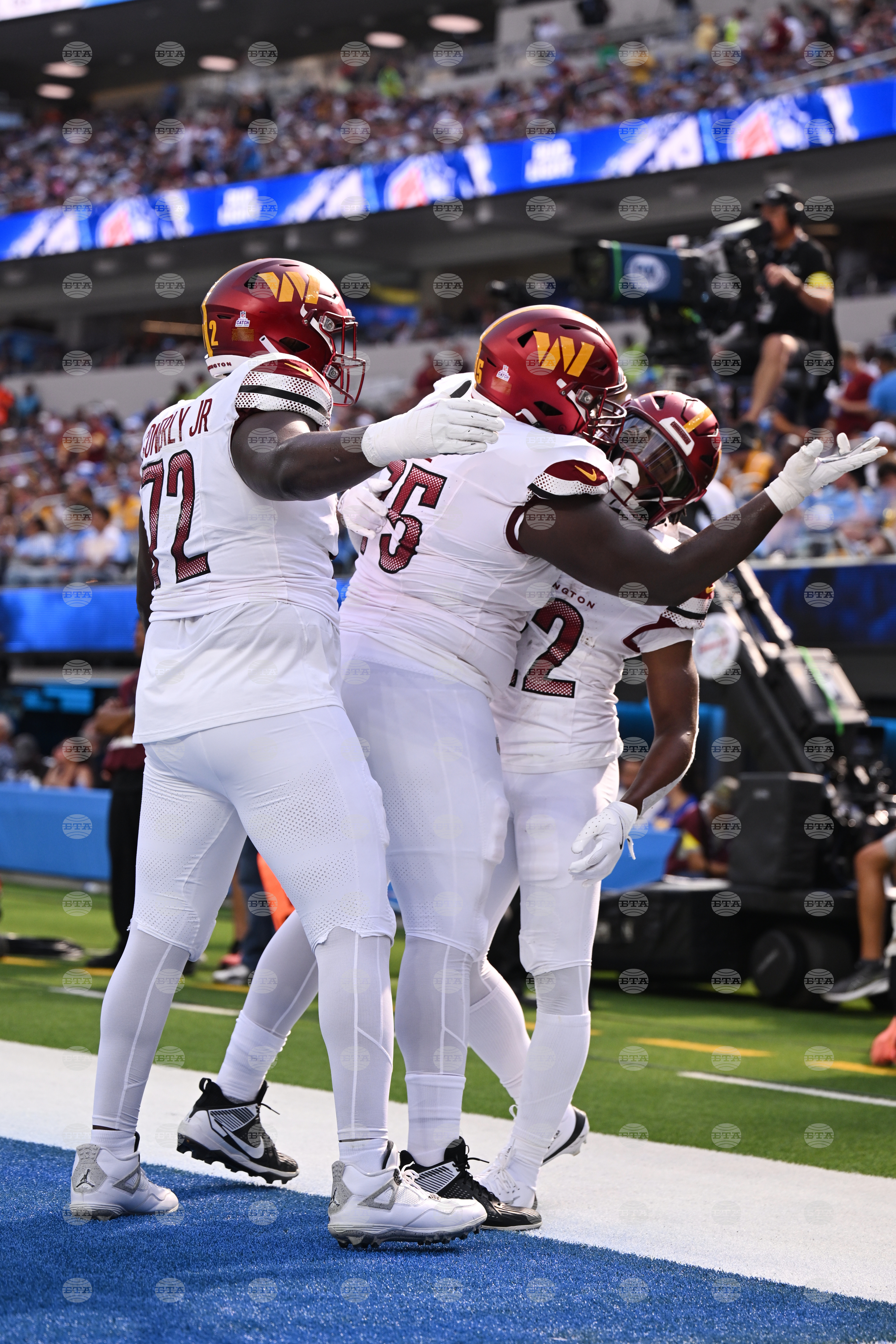 The Washington Commanders celebrates after recovering a fumble by Los Angeles Chargers wide receiver Quentin Johnston during the first half of an NFL football game Sunday, Oct. 5, 2025, in Inglewood, Calif. (AP Photo/Eric Thayer)