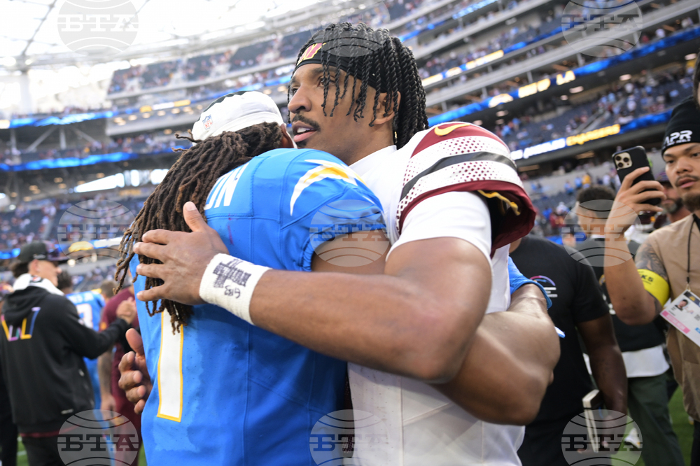 Washington Commanders quarterback Jayden Daniels, right, gets a hug from Los Angeles Chargers wide receiver Quentin Johnston after an NFL football game Sunday, Oct. 5, 2025, in Inglewood, Calif. (AP Photo/Carrie Giordano)