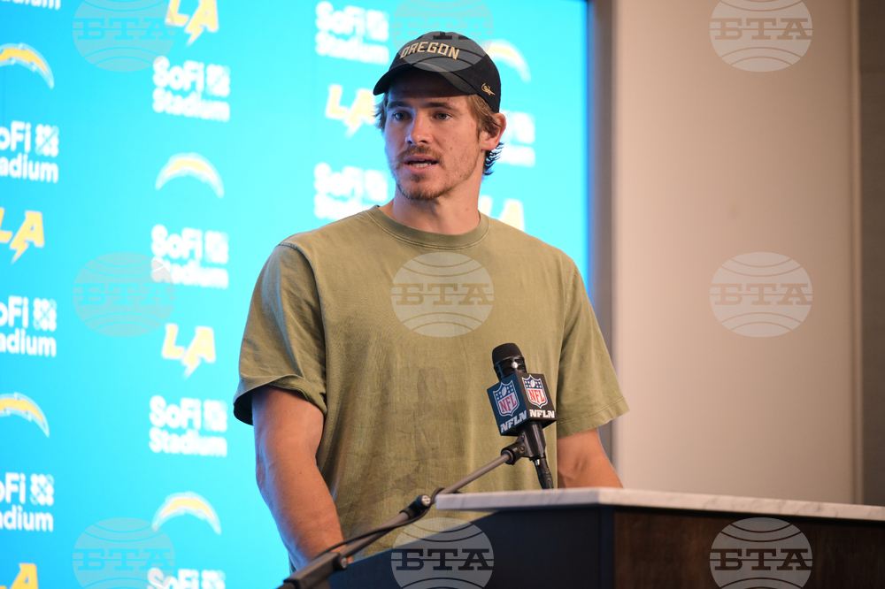 Los Angeles Chargers quarterback Justin Herbert answers questions after an NFL football game against the Washington Commanders, Sunday, Oct. 5, 2025, in Inglewood, Calif. (AP Photo/Carrie Giordano)