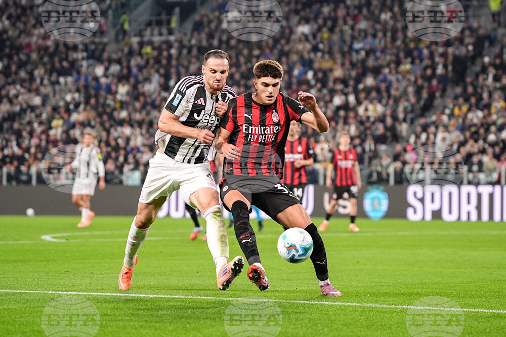 Juventus' Federico Gatti, right, fights for the ball with AC Milan's Davide Bartesaghi during the Serie A soccer match between Juventus and AC Milan at the Allianz Stadium in Turin, Italy, Sunday Oct. 5, 2025. (Marco Alpozzi//LaPresse via AP)