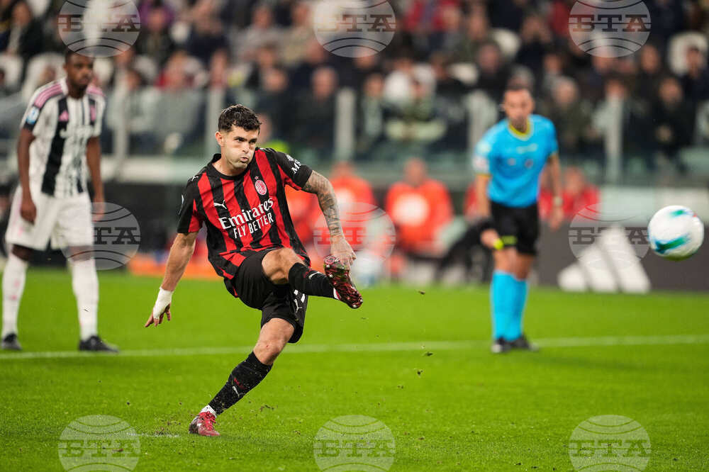 AC Milan's Christian Pulisic misses a penalty kick during the Serie A soccer match between Juventus and AC Milan at the Allianz Stadium in Turin, Italy, Sunday Oct. 5, 2025. (Fabio Ferrari/LaPresse via AP)