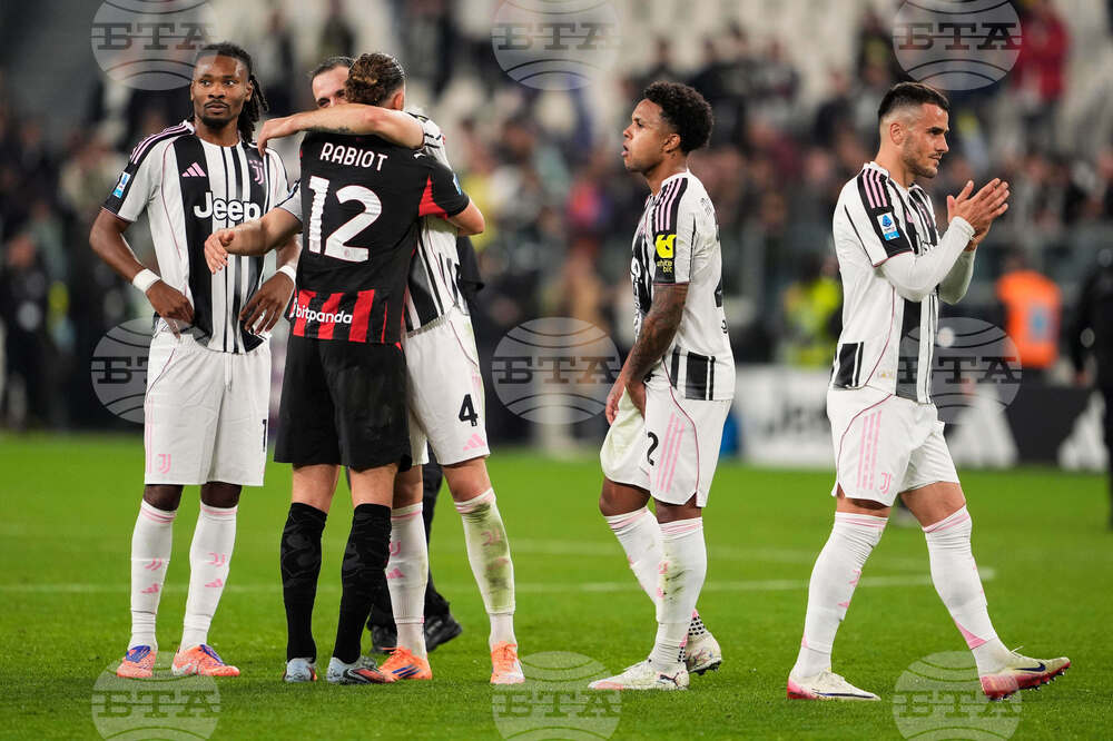 Juventus' Lloyd Kelly, right, fights for the ball with AC Milan's Strahinja Pavlovic during the Serie A soccer match between Juventus and AC Milan at the Allianz Stadium in Turin, Italy, Sunday Oct. 5, 2025. (Marco Alpozzi//LaPresse via AP)