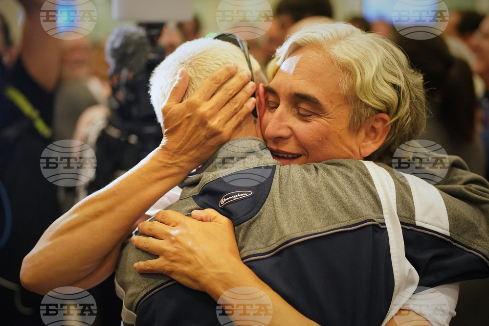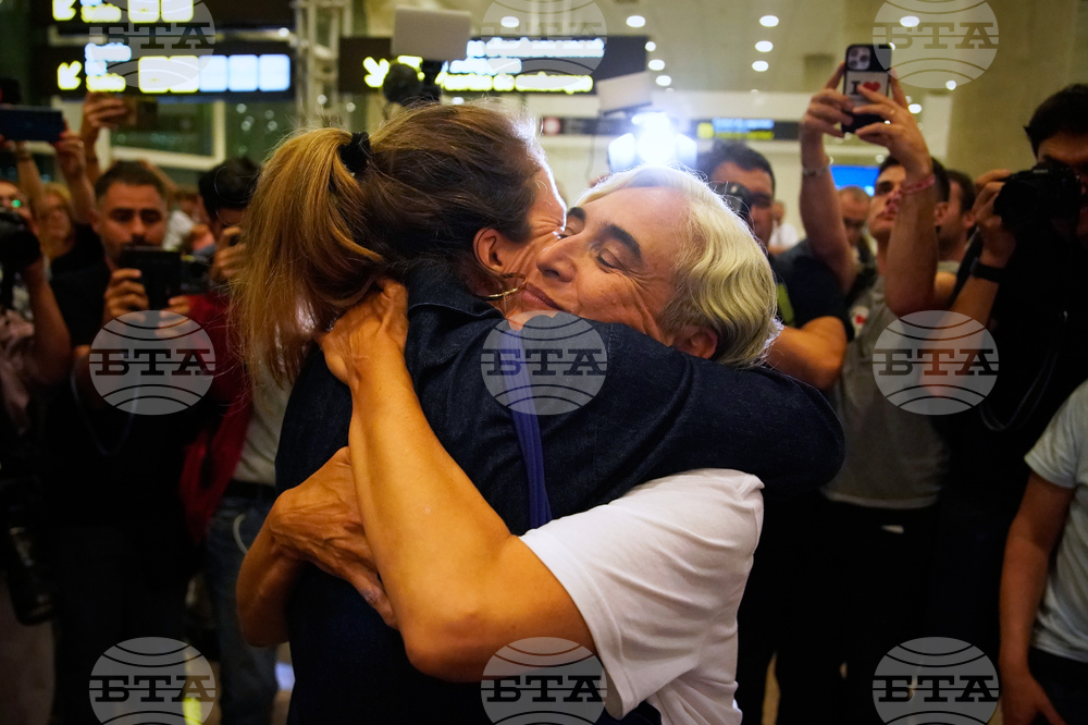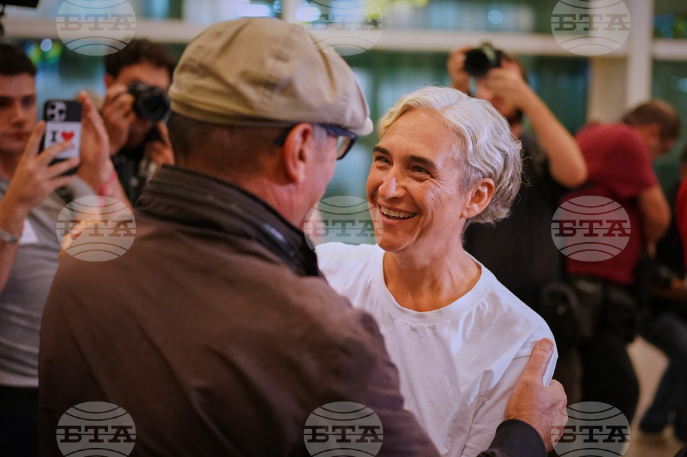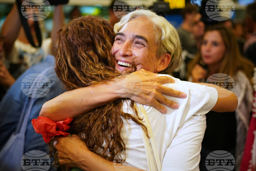 Former Barcelona mayor Ada Colau, right, is embraced by friends as she arrives at the airport in Barcelona, Spain, Sunday, Oct. 5, 2025, after being arrested on the Global Sumud Flotilla and subsequently released by the Israeli authorities. (AP Photo/Joan Mateu Parra)