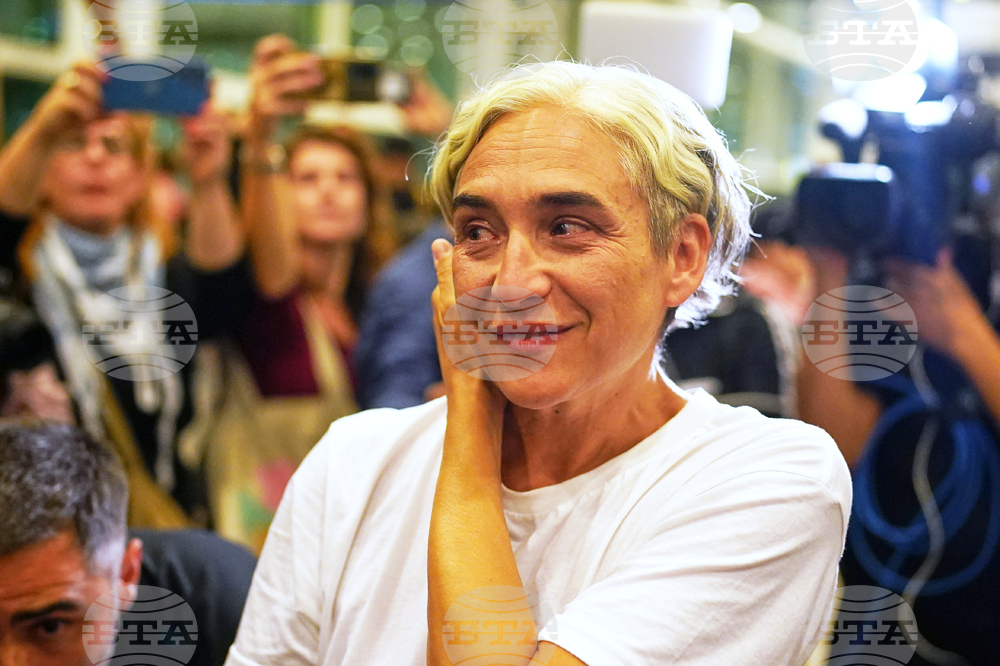 Former Barcelona mayor Ada Colau gets emotional as she arrives at the airport in Barcelona, Spain, Sunday, Oct. 5, 2025, after being arrested on the Global Sumud Flotilla and subsequently released by the Israeli authorities. (AP Photo/Joan Mateu Parra)