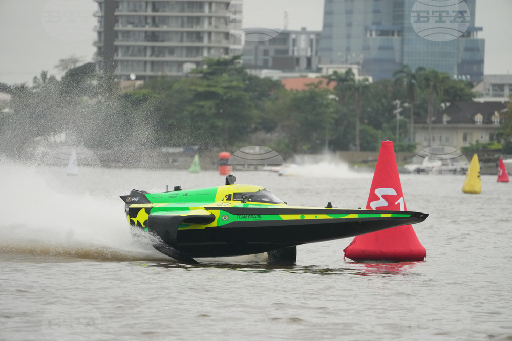 Team Brazil, competes during the E1 powerboat Grand Prix Championship race in Lagos, Nigeria, Sunday, Oct. 5, 2025. (AP Photo/Sunday Alamba)