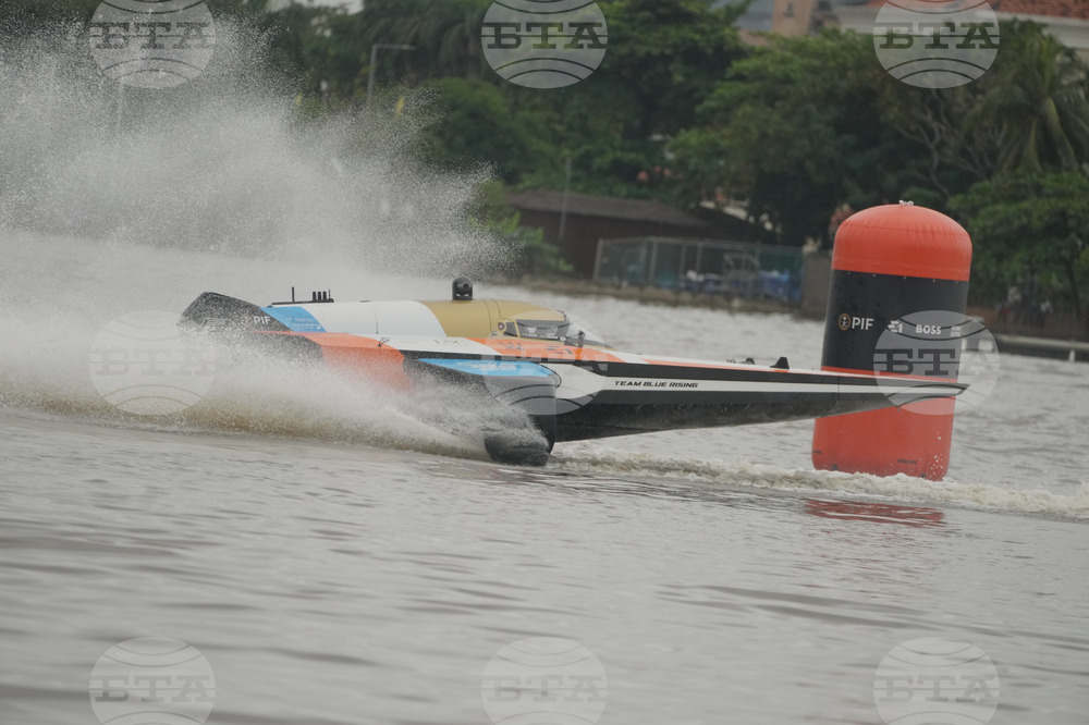 Team Blue Rising, competes during the E1 powerboat Grand Prix Championship race in Lagos, Nigeria, Sunday, Oct. 5, 2025. (AP Photo/Sunday Alamba)