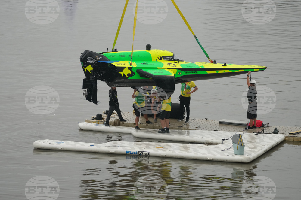 Workers launch a Team Brazil E1 powerboat before the Grand Prix championship race in Lagos, Nigeria, Sunday, Oct. 5, 2025. (AP Photo/Sunday Alamba)