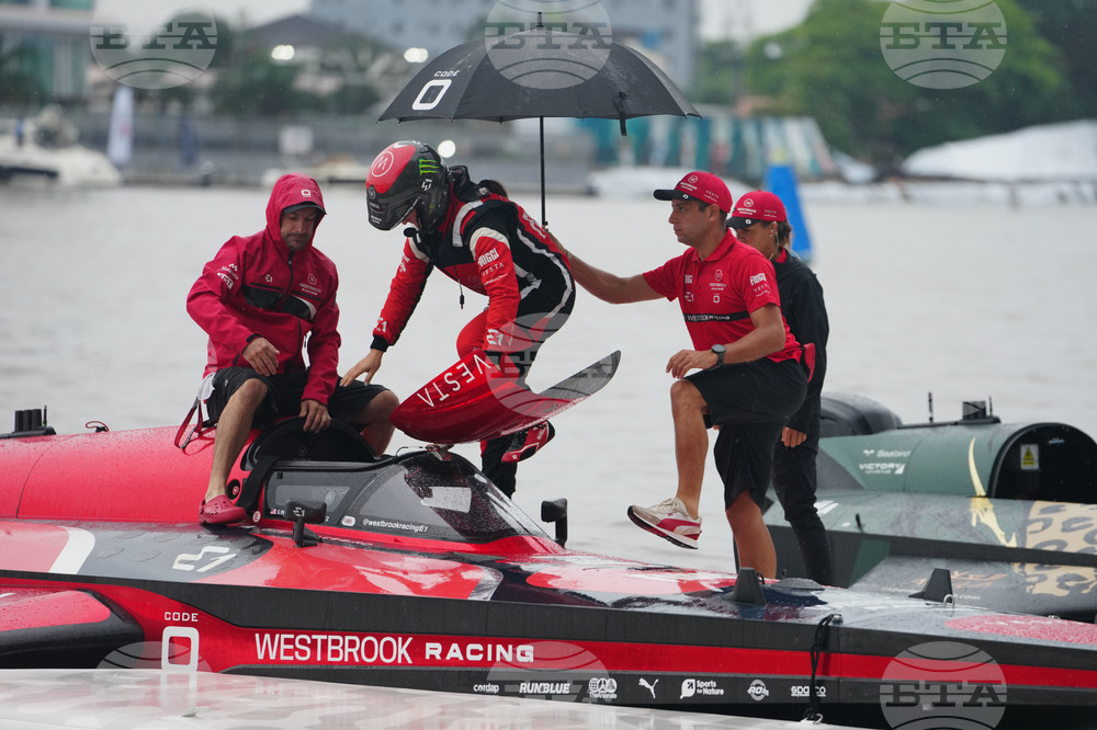 A pilot from Westbrook racing, prepares to competes at the E1 powerboat Grand Prix Championship race in Lagos, Nigeria, Sunday, Oct. 5, 2025. (AP Photo/Sunday Alamba)