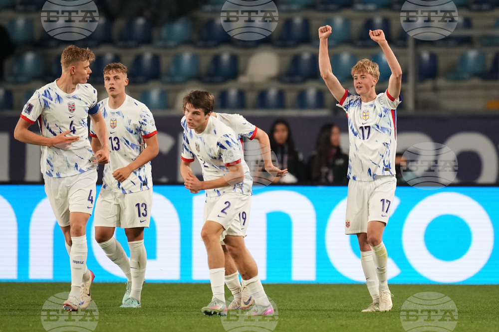 Norway's Niklas Fuglestad celebrates scoring his side's opening goal against Saudi Arabia during a FIFA U-20 World Cup Group E soccer match at El Teniente Stadium in Rancagua, Chile, Sunday, Oct. 5, 2025. (AP Photo/Andre Penner)