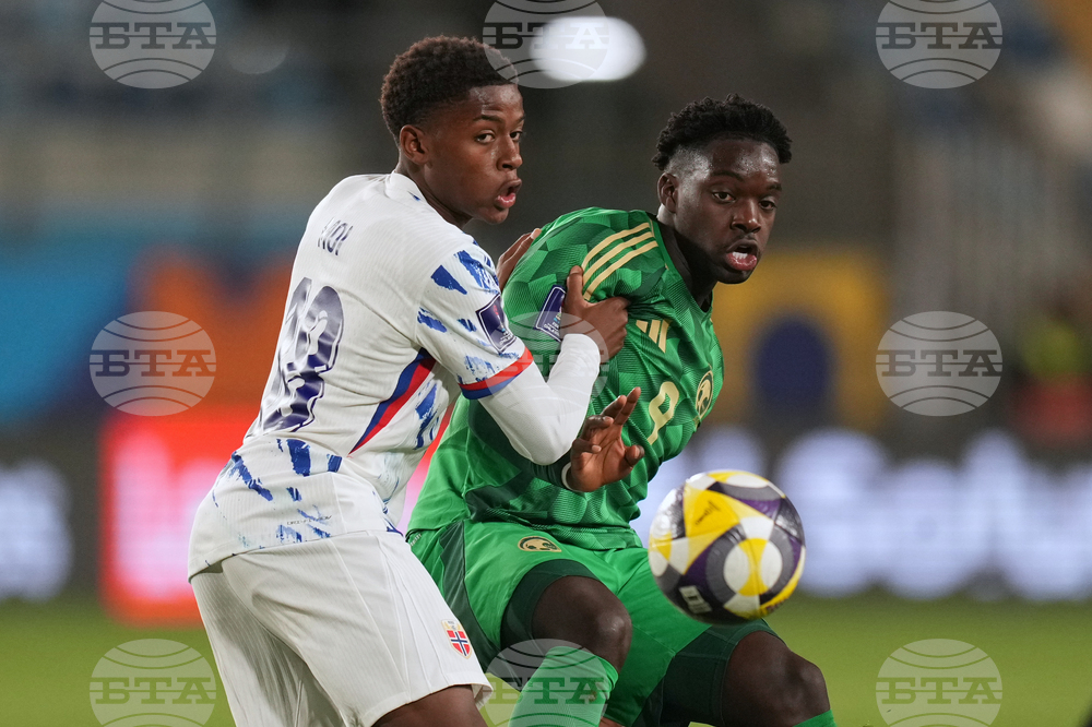 Norway's Julian Laegreid, left, and Saudi Arabia's Rakan Al-Ghamdi vie for the ball during a FIFA U-20 World Cup Group E soccer match at El Teniente Stadium in Rancagua, Chile, Sunday, Oct. 5, 2025. (AP Photo/Andre Penner)