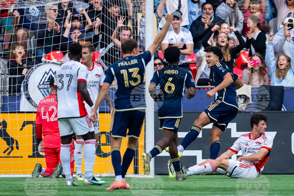 Vancouver Whitecaps' Sebastian Berhalter scores against the San Jose Earthquakes during the second half of an MLS soccer match in Vancouver, British Columbia, Sunday, Oct. 5, 2025. (Ethan Cairns/The Canadian Press via AP)
