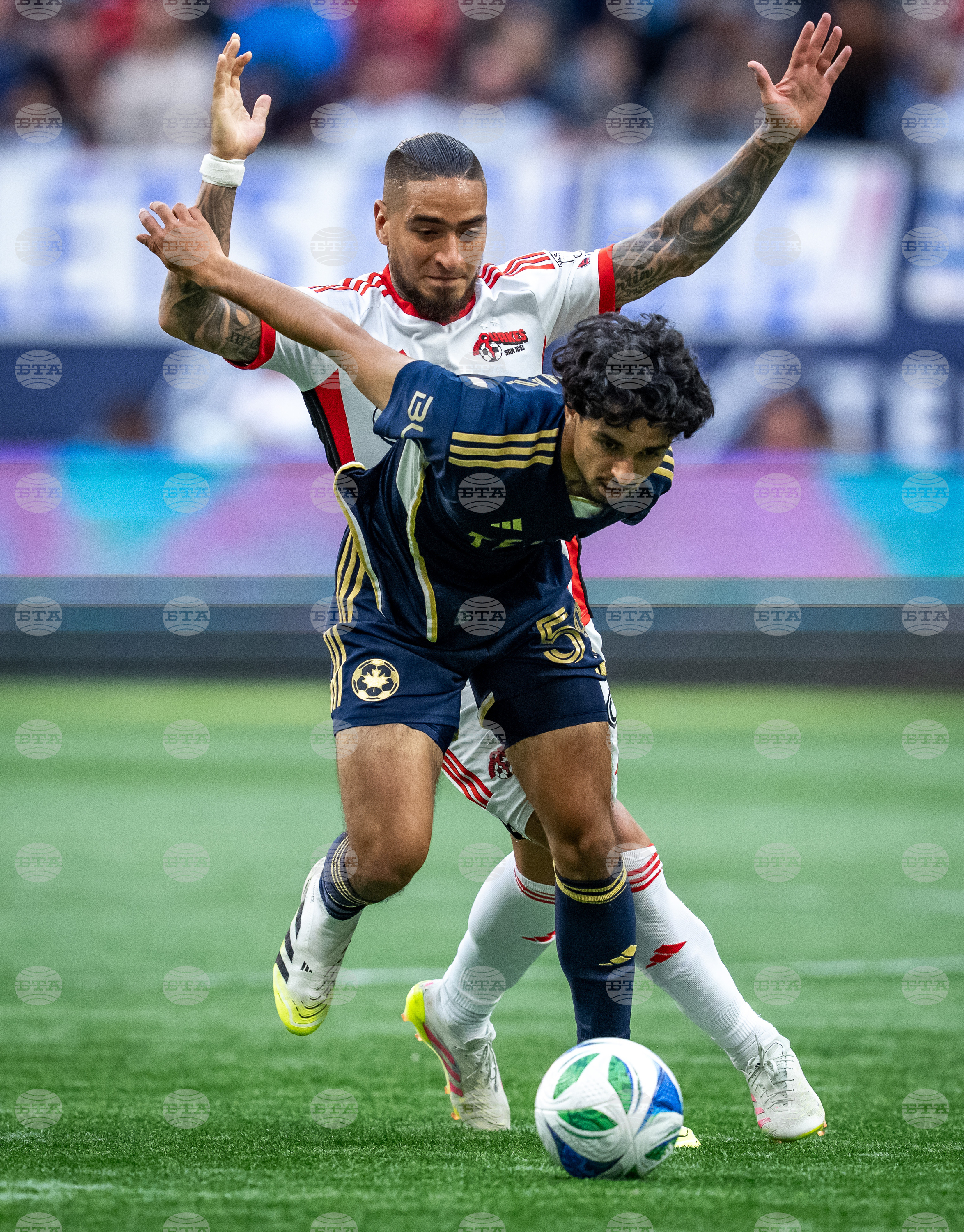 San Jose Earthquakes' Benji Kikanovic, left, and Vancouver Whitecaps' Tate Johnson, right, vie for the ball during the first half of an MLS soccer match in Vancouver, British Columbia, Sunday, Oct. 5, 2025. (Ethan Cairns/The Canadian Press via AP)