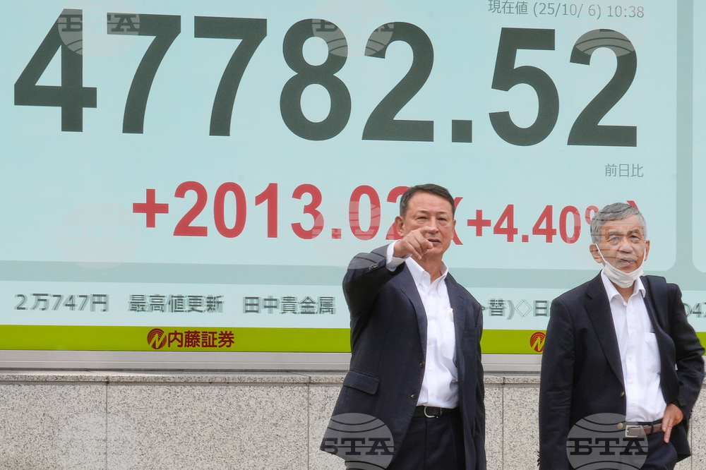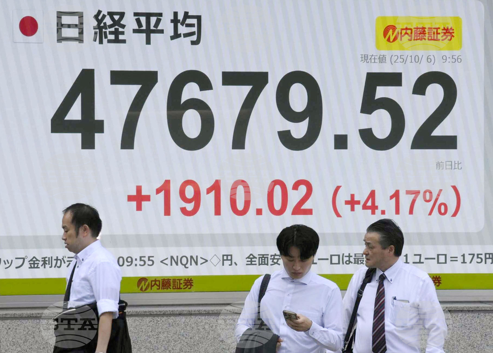 People stand in front of an electronic stock board showing Japan's Nikkei 225 index at a securities firm in Tokyo, Monday, Oct. 6, 2025. (Kyodo News via AP)