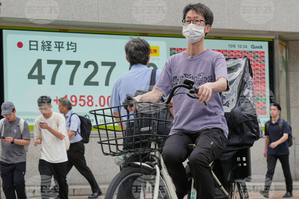 A person rides a bicycle in front of an electronic stock board showing Japan's Nikkei index at a securities firm Monday, Oct. 6, 2025, in Tokyo. (AP Photo/Eugene Hoshiko)