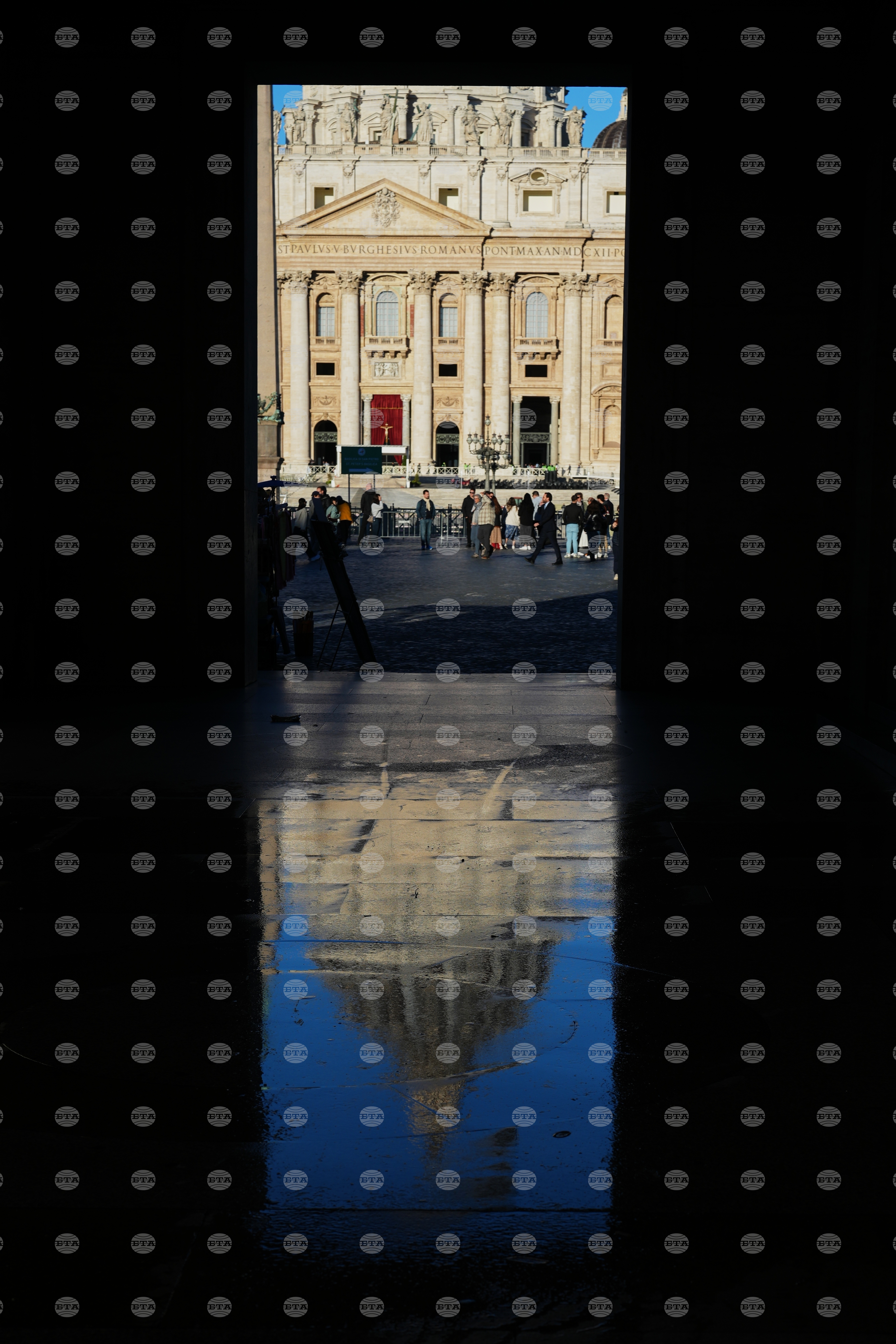 St. Peter's Basilica is reflected on a wet pavement, in Rome, Monday, Oct. 6, 2025. (AP Photo/Andrew Medichini)
