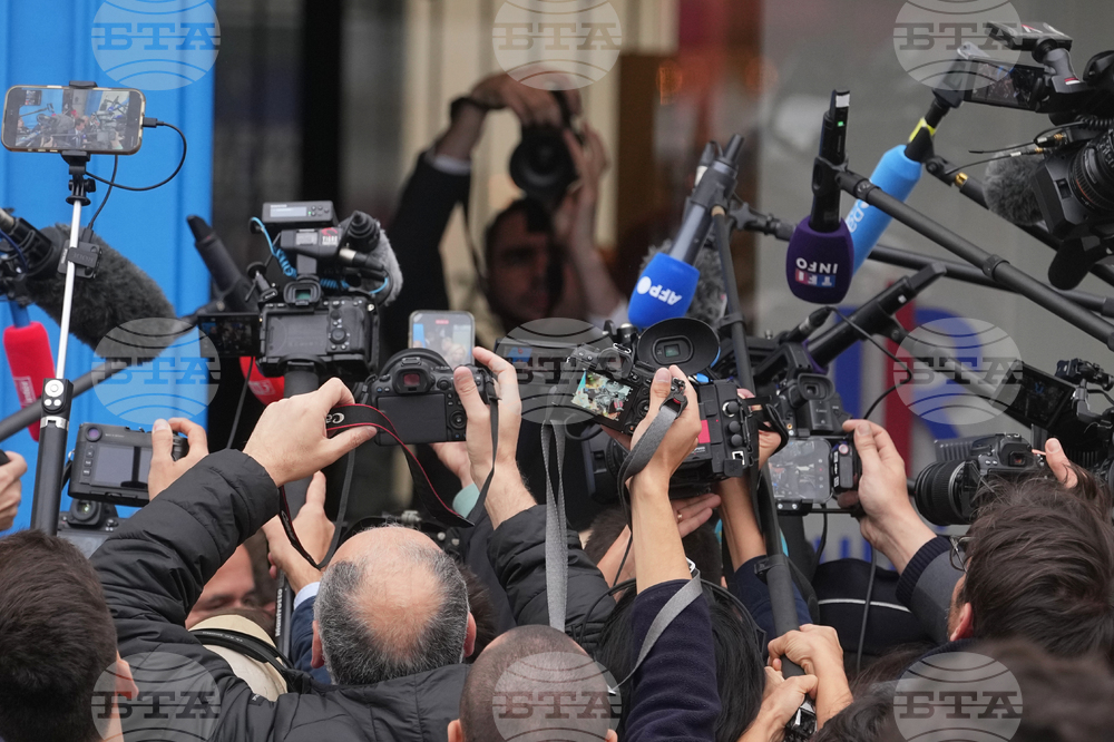 Reporters gather outside the conservative Party Les Republicains headquarters Monday, Oct. 6, 2025 in Paris after France's prime minister Sebastien Lecornu resigned plunging the country into a deep political crisis. (AP Photo/Thibault Camus)