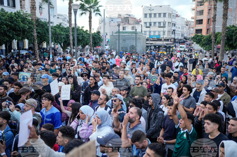People take part in a youth led protest against corruption and calling for healthcare and education reforms, in Casablanca, Morocco, Sunday, Oct. 5, 2025. (AP Photo/Mosa'ab Elshamy)