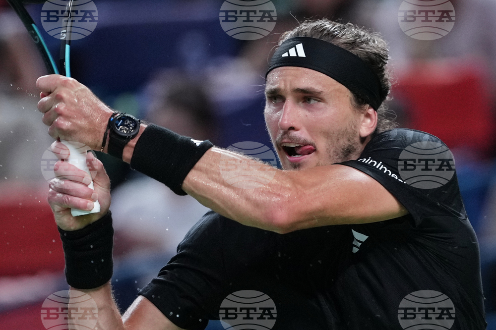 Alexander Zverev of Germany returns to Arthur Rinderknech of France during the men's singles match of the Shanghai Masters tennis tournament at Qizhong Forest Sports City Tennis Center, in Shanghai, China, Monday, October. 6, 2025. (AP Photo/Andy Wong)
