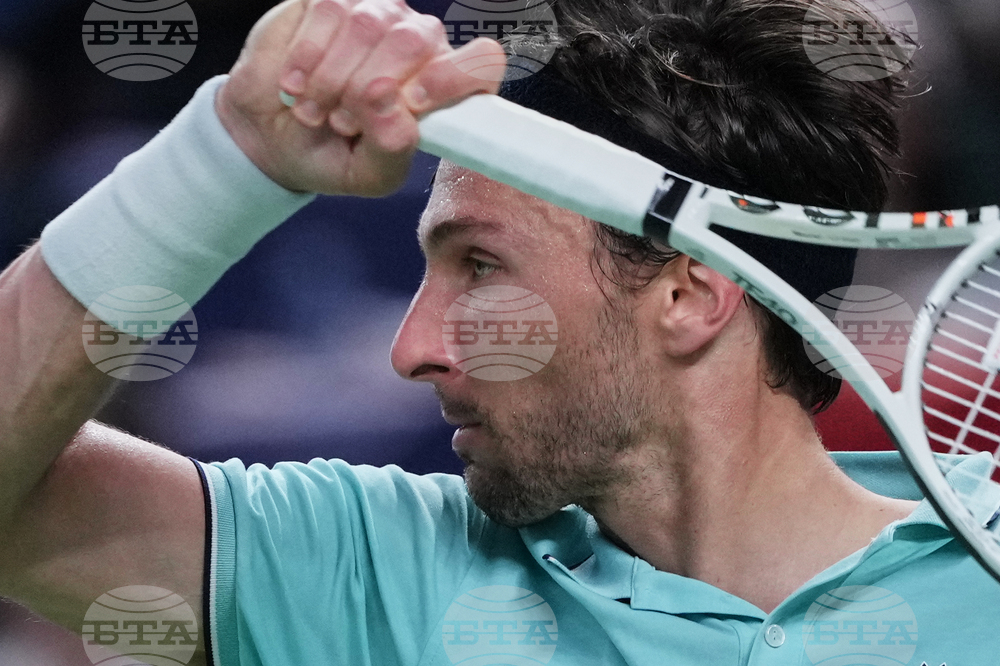 Zizou Bergs, of Belgium, plays a backhand against Gabriel Diallo, of Canada, during the men's singles match of the Shanghai Masters tennis tournament at Qizhong Forest Sports City Tennis Center, in Shanghai, China, Tuesday, Oct. 7, 2025. (AP Photo/Andy Wong)